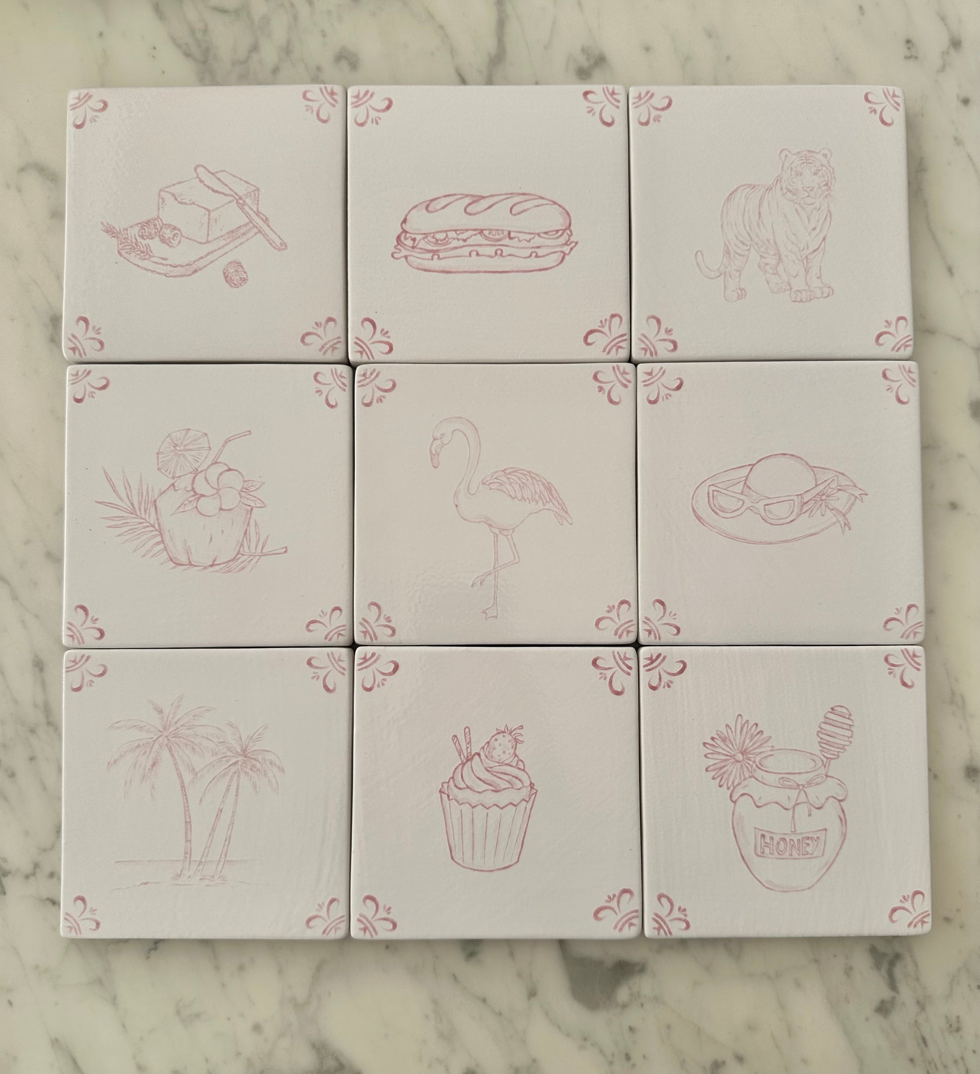 Every single tile is hand drawn and hand painted in our studio in Newport, Sydney. Given the artisanal nature of each piece, there will inevitably be variations in each piece such as variations in glaze, marks, or imperfections. We believe this is what makes each tile a piece of art, and not an identical, mass produced object.