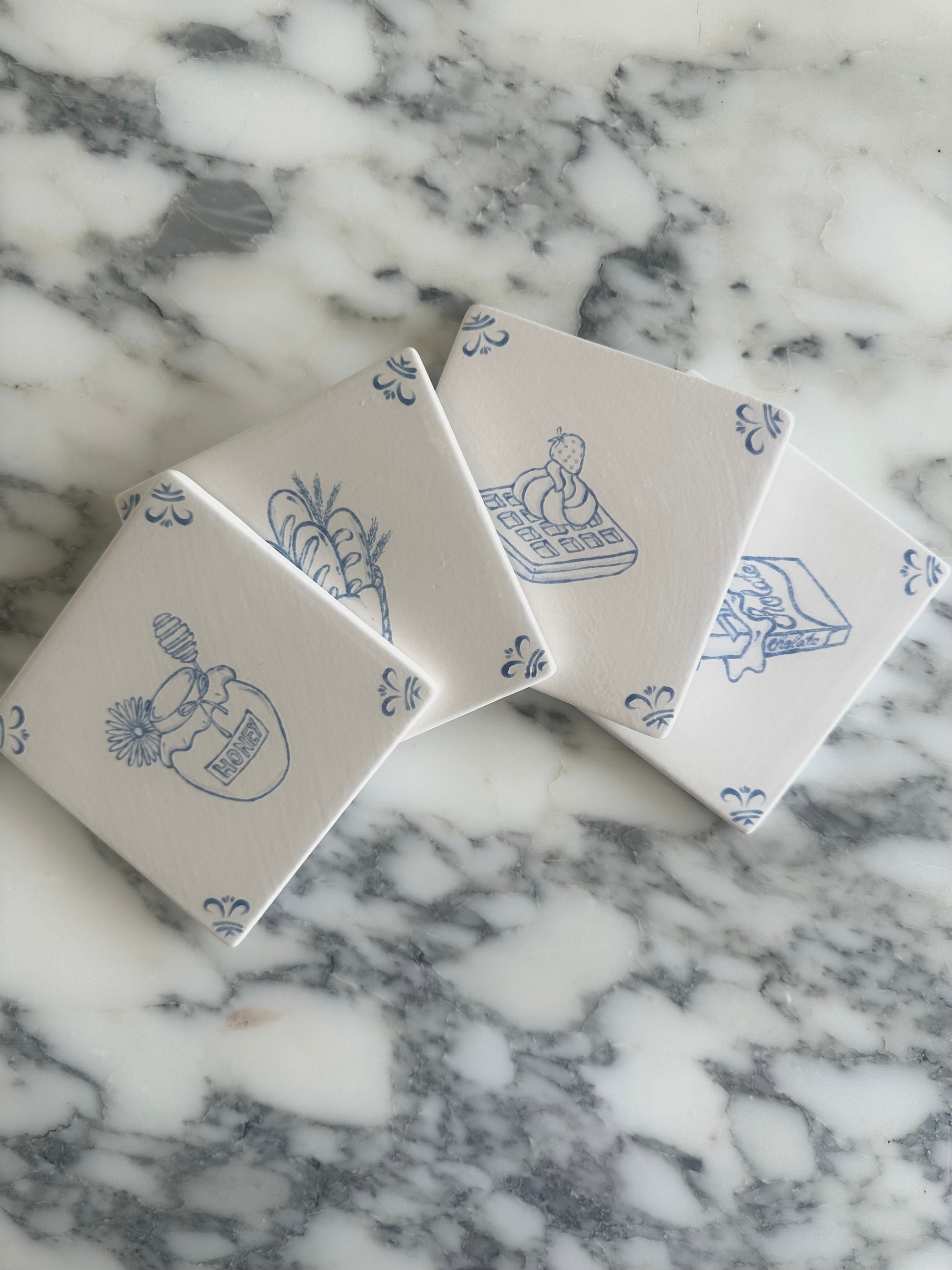 Every single tile is hand drawn and hand painted in our studio in Newport, Sydney. Given the artisanal nature of each piece, there will inevitably be variations in each piece such as variations in glaze, marks, or imperfections. We believe this is what makes each tile a piece of art, and not an identical, mass produced object.